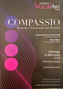 Das Brixner Ensemble VocalArt unter der Leitung von Marian Polin öffnet in seinem aktuellen Passionsprogramm compassio („Mitleid“) ein musikalisches Zeitfenster in einen Karfreitag-Abend um die Mitte des 18. Jahrhunderts. Es erklingen die Vertonungen zweier liturgischer Texte, die man aus heutiger Sicht überhaupt nicht mehr mit diesem Tag in Verbindung bringen würde: zum einen die Responsorien (dreiteilige Antwortgesänge zu den Lamentationen des Jeremia) zu den drei Nokturnen in der Matutin (Morgengebet) des Karsamstags, welche durch die damals praktizierte anticipatio festorum bereits am Vorabend gehalten wurde. Zum anderen die mittelalterliche Dichtung des Stabat Mater, zu singen am mittlerweile nicht mehr in der Fastenzeit, sondern im September liegenden Fest Sieben Schmerzen Mariens. In der Tradition des Santo Sepolcro, der musikalischen Totenwache, wurde dessen Vertonung allerdings auch häufig am Abend des Karfreitags gegeben.